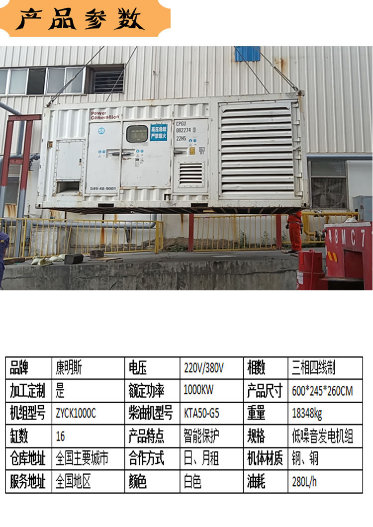 公司為客戶供應(yīng)有多種型號(hào)的康明斯發(fā)電機(jī)組,可以根據(jù)客戶自身用電需求使用相應(yīng)功率的發(fā)電機(jī)組供電。公司提供的功率小到50KW,大到1600KW的功率均有供應(yīng)。在這我公司就簡(jiǎn)單的用1000KW的康明斯發(fā)電機(jī)組為例,簡(jiǎn)單介紹一下相關(guān)參數(shù)。